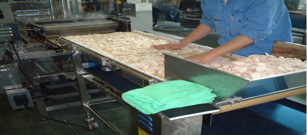 原料通过特氟隆网带传送带将定量的原料投入到油炸机