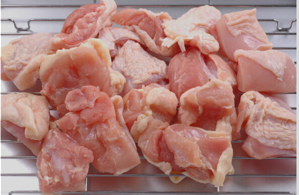 1.材料的准备 把鸡腿肉切成4-5cm的肉块并放在托盘上。